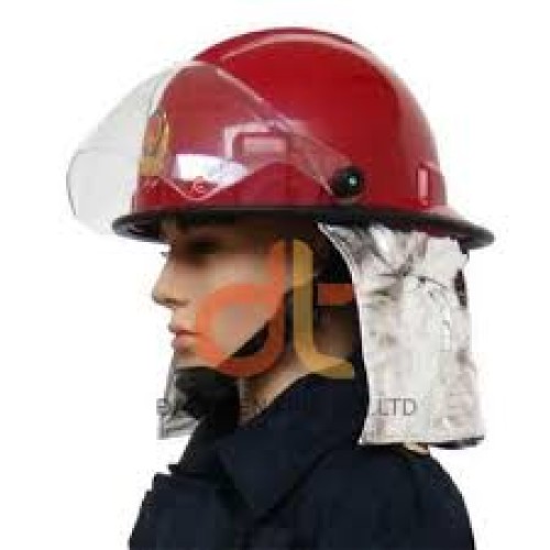 Mũ cứu hoả có tấm kính chịu nhiệt cao làm bằng vật liệu APEC- carbonate có thể nâng lên hạ xuống, có tấm phủ trùm vai, sản xuất theo tiêu chuẩn châu âu.